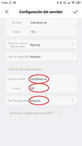Al seguir bajando deberemos cambiar los valores del servidor de correo saliente: El servidor SMTP coincidirá con el servidor de entrada: mail.dominio.extensión . El valor de Puerto en este caso será 587 y el Tipo de Seguridad: ninguna.