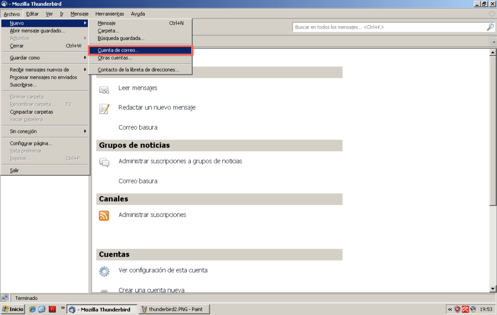 Accedemos al menu Archivo > Nuevo > Cuenta de correo